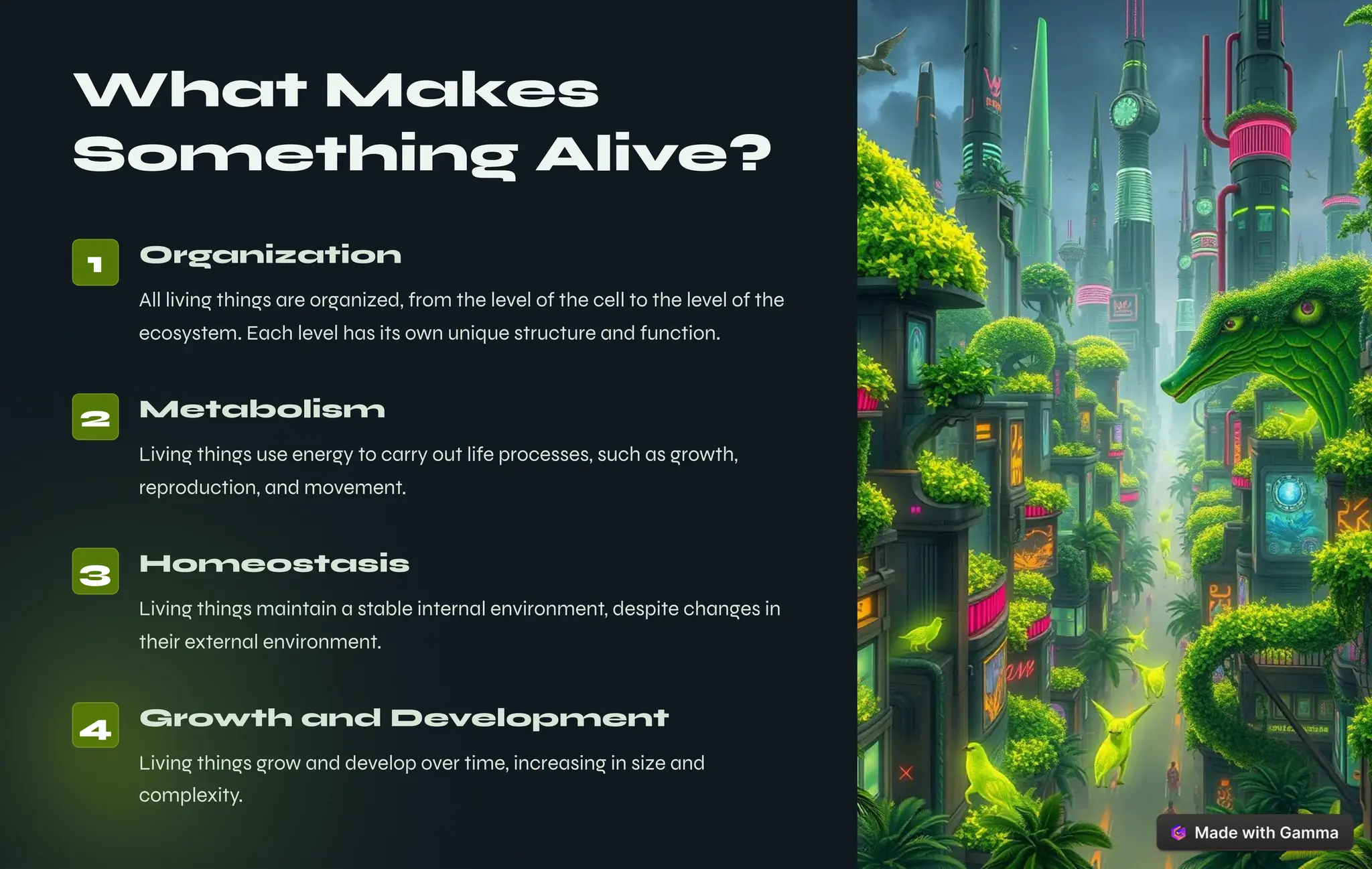The document outlines key unifying themes in biology, such as organization, metabolism, homeostasis, growth, and evolution, that define living organisms. It discusses the processes of inheritance and reproduction, emphasizing the roles of genetic variation, natural selection, and adaptation in evolution. Additionally, it highlights the importance of interdependence within ecosystems and the impact of science and technology on society.