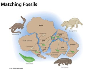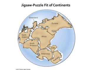 A unifying theory explains diverse observations across a science by relating seemingly unrelated phenomena. Plate tectonics unifies earth sciences by explaining earthquakes, volcanoes, mountain formation, and more. It affects climate, organisms, and resource distribution. Early scientists noted matching rock sequences and glaciation on continents like India, Australia, and South America, proposing they were once joined in a supercontinent called Gondwanaland. Later, others presented hypotheses of continental drift and a supercontinent called Pangaea formed by drifting continents. Studies of paleomagnetism, seafloor spreading at ocean ridges, and radiometric dating provided evidence that supported plate tectonics theory.