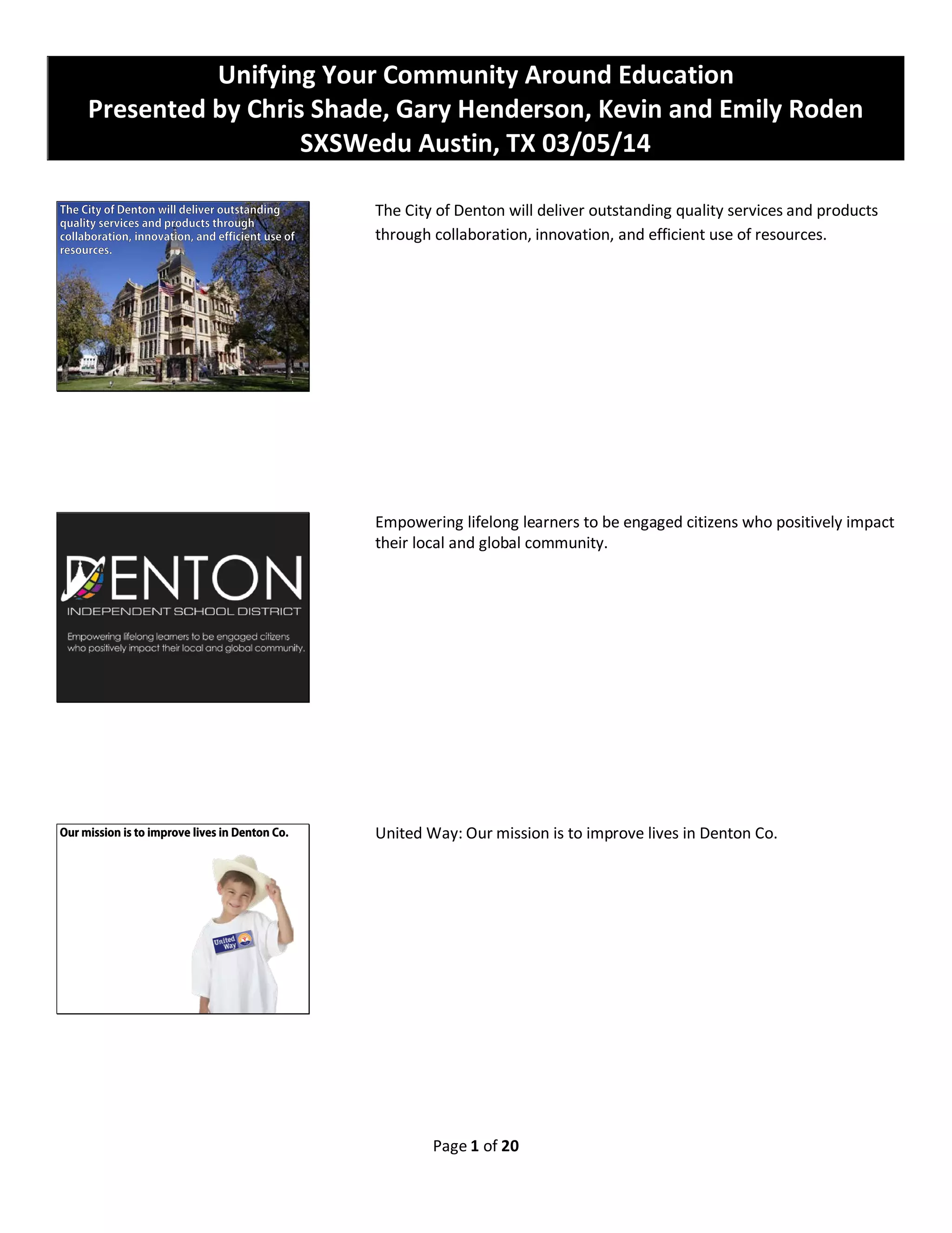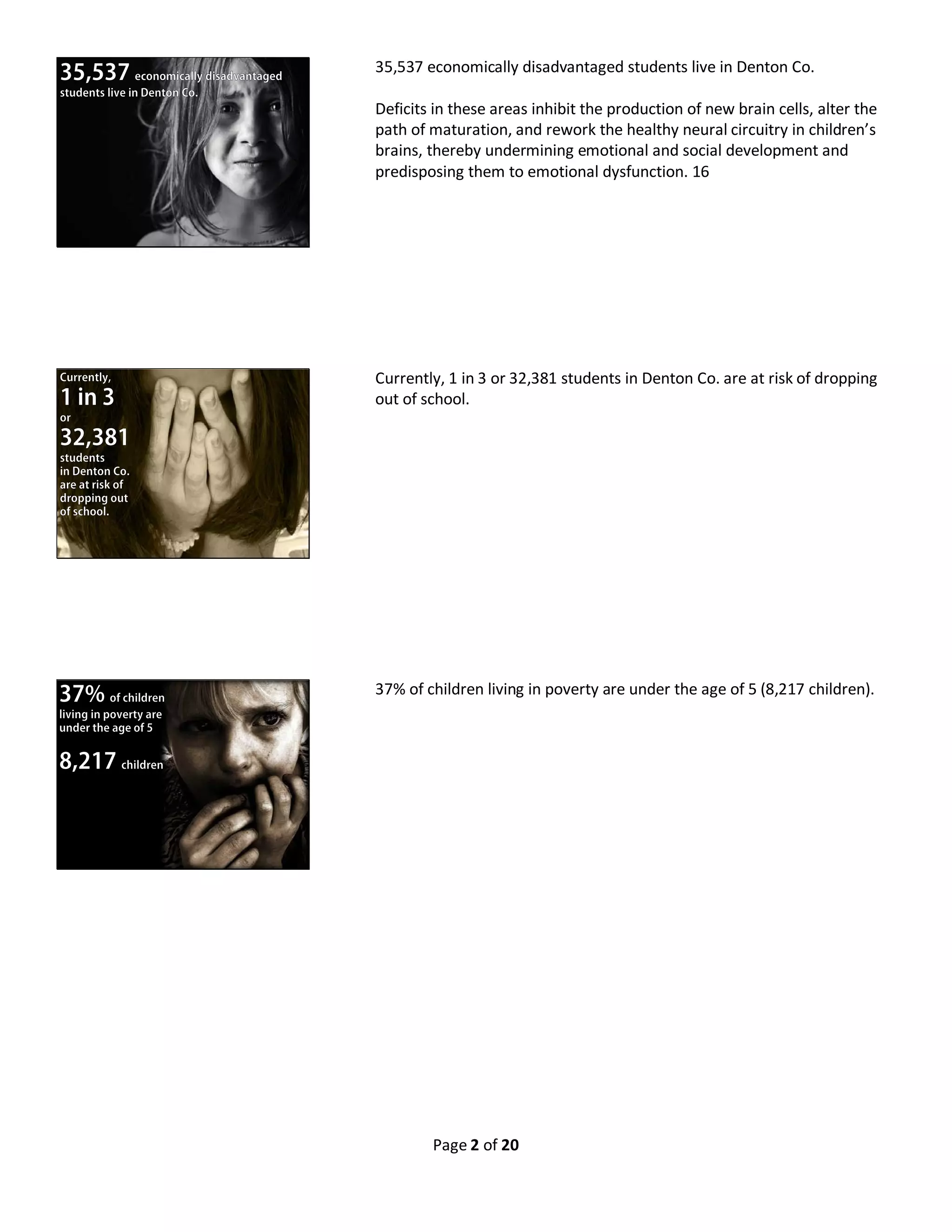 This document provides information about efforts to improve childhood outcomes and education in Denton County, Texas. It discusses how early childhood experiences, including parenting quality, affect brain development and later life outcomes. Over a third of students in Denton County are at risk of dropping out of school, and many children live in poverty. The document emphasizes that providing children with secure attachments to caregivers through nurturing relationships can help build resilience against the effects of early life stress or adversity. It introduces Ready Rosie, a program that sends short daily videos to parents with simple interactive activities to do with young children using everyday materials.