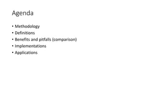 Unikernels are specialized virtual machines compiled from application code and only necessary operating system components. They provide benefits like reduced memory usage, faster load times, and a smaller attack surface compared to traditional virtual machines. Several unikernel implementations exist like MirageOS, Rumprun, and IncludeOS which are compiled from different languages and have varying boot times, image sizes, and hypervisor support. Unikernels are being applied to applications such as proxies, edge computing, and IoT gateways.