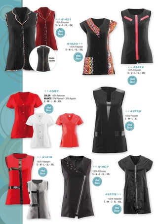 El documento detalla una variedad de prendas de vestir, especificando materiales como 100% poliéster y combinaciones con algodón, así como las tallas disponibles. Se mencionan diferentes códigos y características de los productos, incluyendo opciones anti deco y tallas únicas. También se incluyen datos de contacto y ubicaciones de la empresa Unilabor.