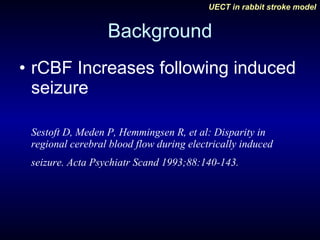 This study evaluated the effects of unilateral electroconvulsive therapy (UECT) on regional cerebral blood flow (rCBF) following experimentally induced stroke in rabbits. Five rabbits underwent right internal carotid artery ligation to induce stroke and were imaged with SPECT scans before and after being randomized to either receive UECT or act as controls. The three rabbits that received UECT showed improvement in rCBF in the affected region on the second SPECT scan, while the two control rabbits showed no improvement, indicating UECT may decrease infarct size following stroke. However, the study was limited by its small sample size.