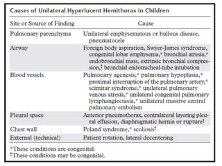 Unilateral hyperlucent hemithorax is a common radiographic finding in pediatric patients, caused by various congenital and acquired pulmonary conditions. Diagnostic evaluation is essential to determine if the hyperlucency is due to true lung pathology or opposing lung opacity, with further imaging investigations often required. Conditions include post-infectious pneumatoceles, congenital lobar emphysema, and airway obstructions, which may lead to significant respiratory complications if not properly managed.