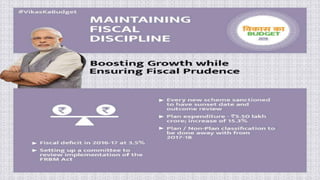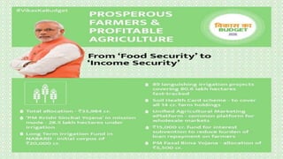 The document outlines the government's budget proposals across 9 pillars including agriculture, rural development, social sector, education, skills and job creation, infrastructure, financial sector reforms, governance, fiscal discipline, and tax reforms. Key highlights include doubling farmers' income, rural employment, health coverage for all, increasing education quality, skill development programs, infrastructure investment, financial stability, ease of doing business, prudent fiscal management, and reducing the tax compliance burden. The document then provides more details on initiatives and allocations for agriculture, rural development, social programs, education, and skill and job creation.