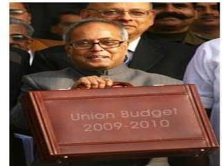 The document provides details about the Union Budget of India for 2009-2010. It summarizes the key aspects of the budget including total estimated expenditures of Rs. 10.2 trillion and estimated revenues of Rs. 6.1 trillion. It outlines spending increases for sectors like rural development, education, health, and infrastructure development. The economic survey highlights India's GDP growth target of 7.5% for 2009-2010 with challenges from the global slowdown and inflation addressed through fiscal policy changes.