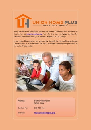Union Home Plus provides mortgage services, including FHA loans, for union members in Washington. The organization emphasizes understanding loan options and offers a supportive community through its nonprofit, Union Ride. Interested individuals can apply for loans and find more information on their website.