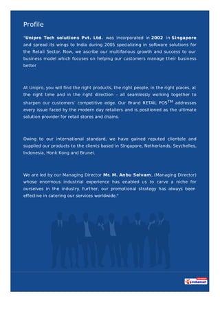 Unipro Tech Solutions Pvt. Ltd., established in 2002 in Singapore and expanded to India in 2005, specializes in comprehensive software solutions for the retail sector. The company is known for its retail management software, alongside a wide range of products that cater to various billing and inventory needs. Led by managing director M. Anbu Selvam, Unipro has garnered a reputable clientele across multiple countries including Singapore and the Netherlands.