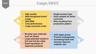 This document discusses Uniqlo's business strategies using various frameworks. It analyzes Uniqlo's strengths, weaknesses, opportunities, and threats in an SWOT analysis. It also examines the five competitive forces Uniqlo faces according to Porter's model. Additionally, it maps out Uniqlo's business model using a Business Model Canvas and proposes a Blue Ocean Strategy to differentiate Uniqlo from competitors like Zara. Finally, it considers ways Uniqlo can apply the ERRC grid to eliminate problems and create new value in the fast fashion industry.