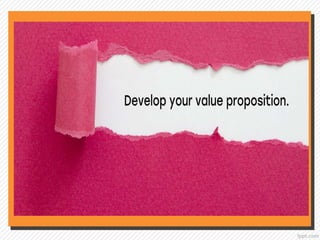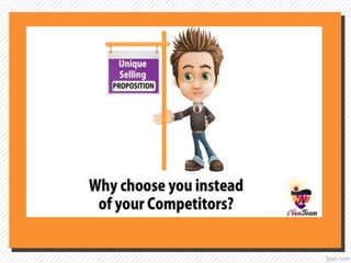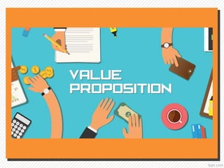 This document discusses unique selling propositions and value propositions. It defines a unique selling proposition as a way to market a product or service that sets it apart from competitors. It provides examples and a 7-step process for constructing a USP. A value proposition is defined as an analysis of the value and benefits provided to customers in exchange for payment. It then outlines a 5-step process for developing an effective value proposition centered around the customer.