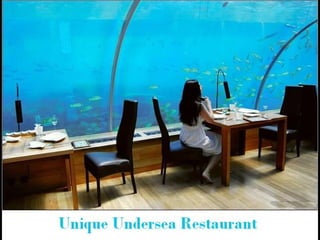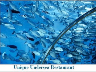 This article describes a unique undersea restaurant located off the coast of Florida. The restaurant is housed in a large dome structure on the ocean floor, allowing diners to eat surrounded by sea life visible through large windows. Diners can observe sharks, stingrays, and schools of fish swimming by as they enjoy their meals in an innovative underwater setting.