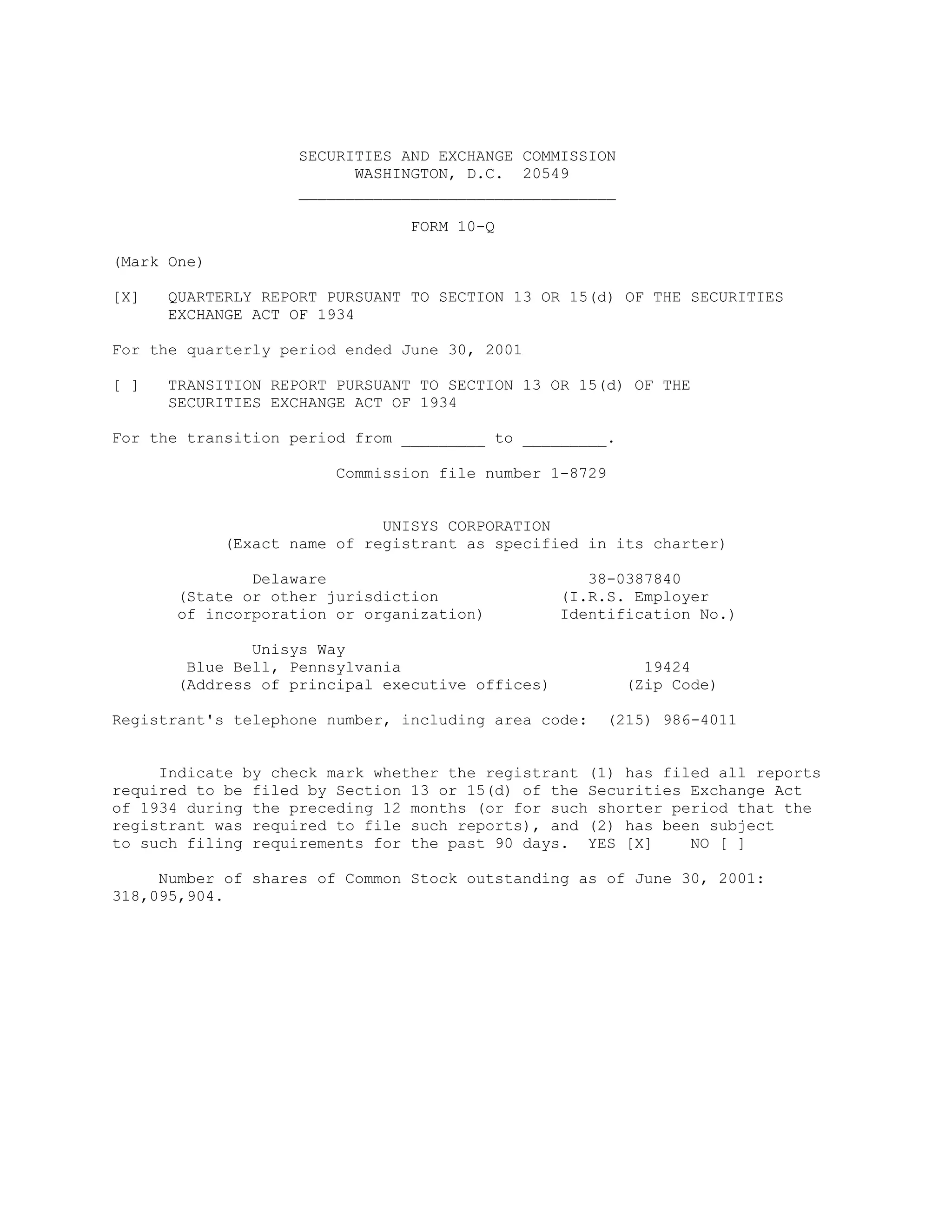 This document is a Form 10-Q quarterly report filed by Unisys Corporation with the SEC for the quarter ended June 30, 2001. The report includes Unisys' consolidated balance sheet, statement of income, statement of cash flows, and notes to the financial statements. It summarizes Unisys' financial performance and position, including reporting a net income of $12.1 million on revenue of $1.46 billion for the quarter.