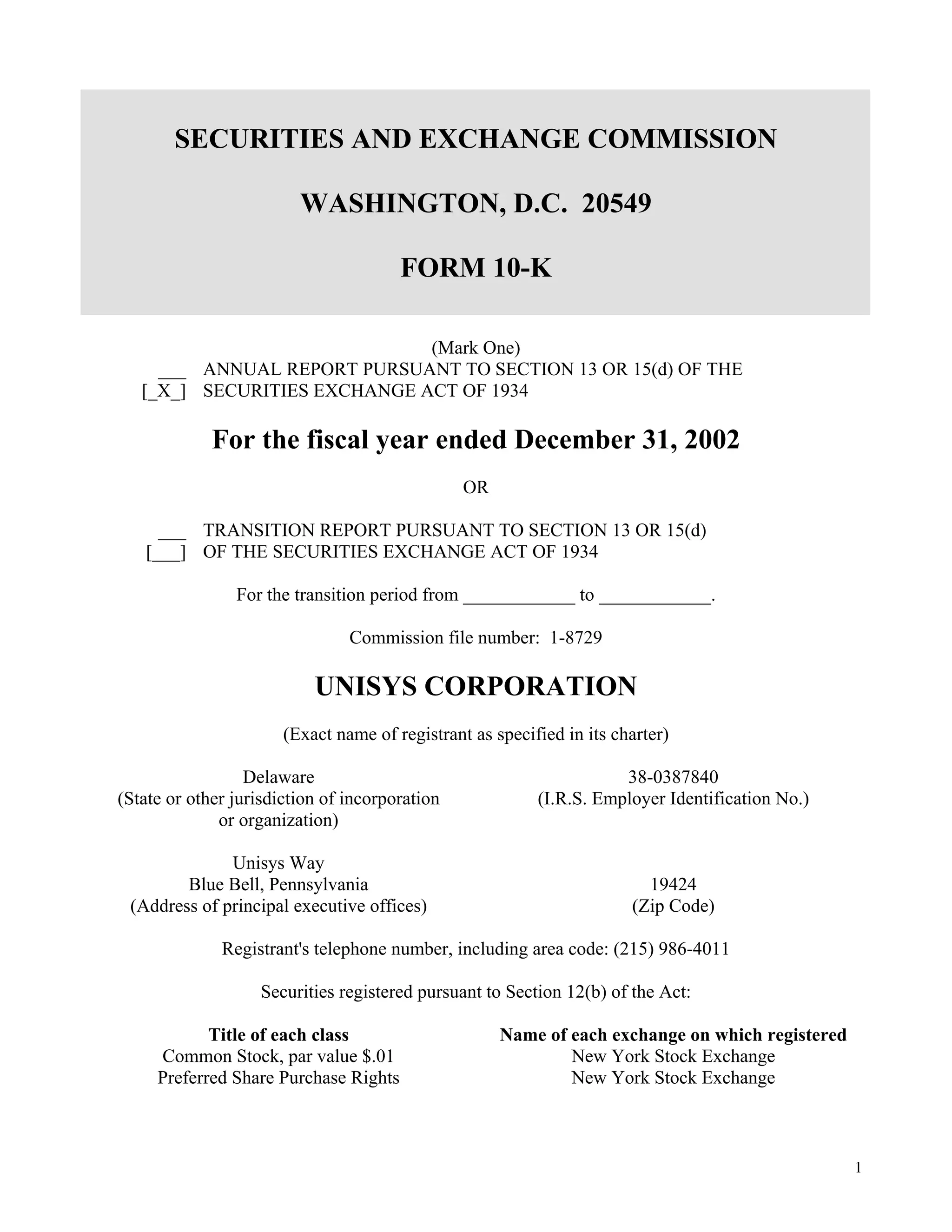 This document is the Unisys Corporation's annual report (Form 10-K) filed with the Securities and Exchange Commission for the fiscal year ending December 31, 2002. It provides information on Unisys' business segments of Services and Technology, its principal products and services, markets, materials, intellectual property, seasonality, customers, backlog, and competition. Unisys is a global information technology company offering systems integration, outsourcing, infrastructure services, server technology, and consulting. Its major customers include governments and companies in financial services, communications and other industries.