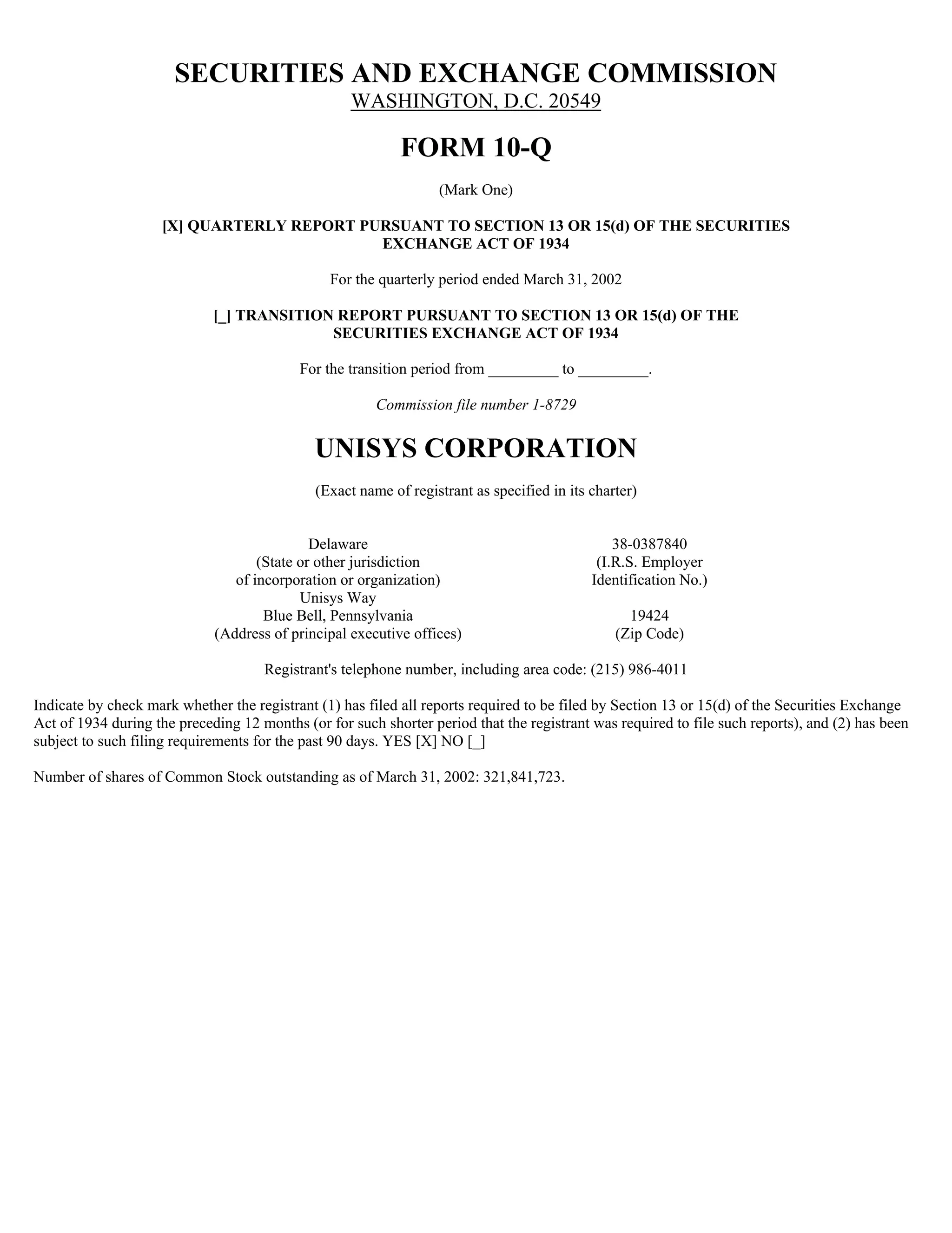 This document is a Form 10-Q quarterly report filed by Unisys Corporation with the Securities and Exchange Commission for the quarterly period ended March 31, 2002. The report includes Unisys' consolidated balance sheet, statement of income, and statement of cash flows for the periods ended March 31, 2002 and 2001. It also includes notes to the financial statements providing additional details on earnings per share calculations, adoption of new accounting standards, segment information, and other items.