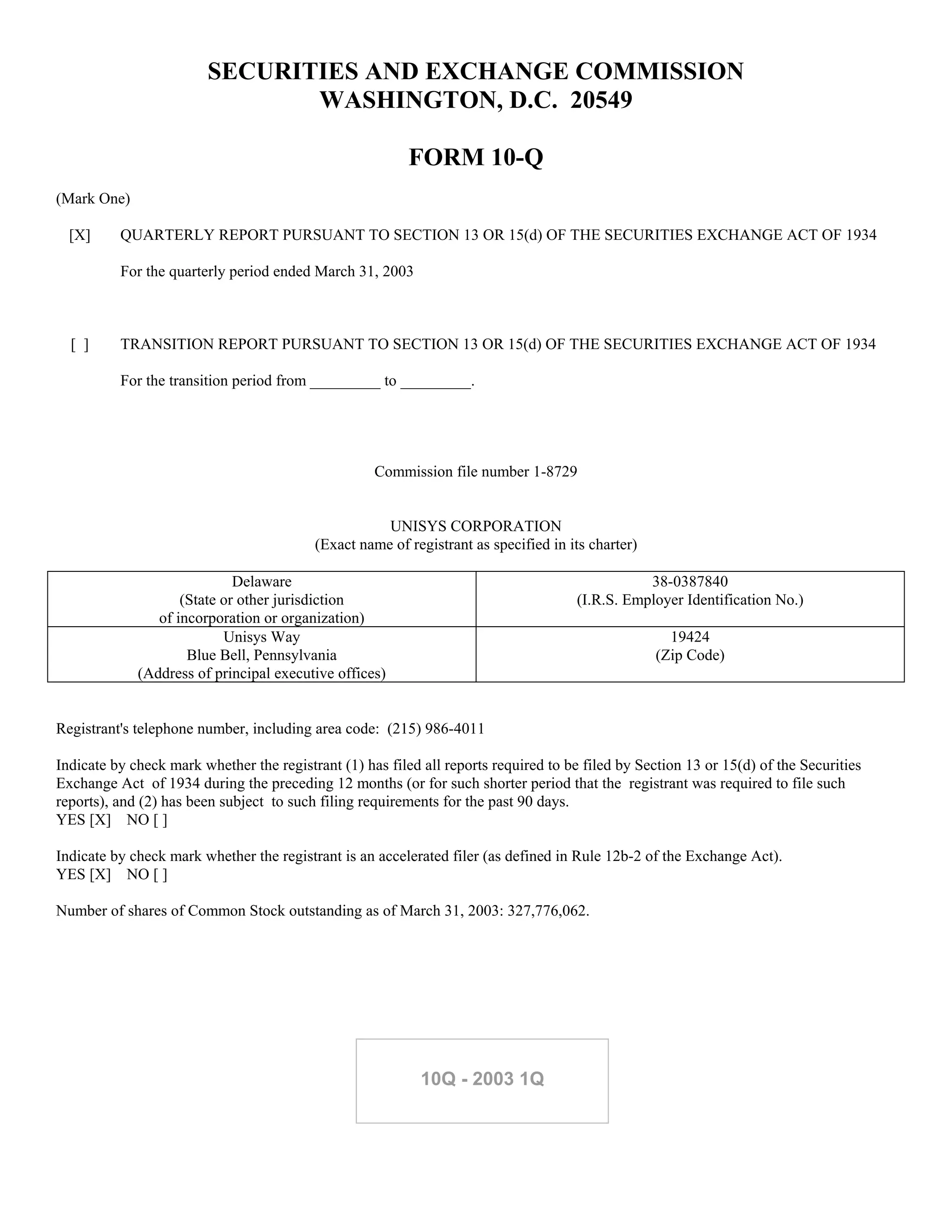 This document is Unisys Corporation's quarterly report filed with the SEC for the quarter ending March 31, 2003. It includes the consolidated balance sheet, income statement, cash flow statement, and notes for the quarter. The balance sheet shows total assets of $5.1 billion including $433.1 million in cash. Total liabilities were $1.9 billion including long-term debt of $1.0 billion. Stockholders' equity was $901.6 million. The income statement shows revenue of $1.4 billion and net income of $38.5 million. Cash flow from operations was negative $64.9 million for the quarter.