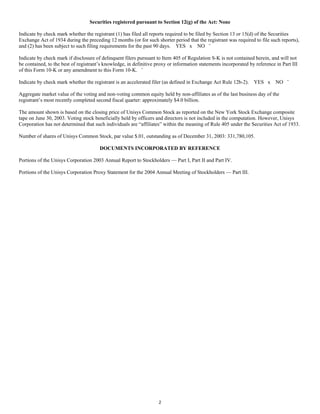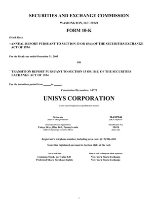 This document is a Form 10-K filed by Unisys Corporation with the Securities and Exchange Commission for the fiscal year ended December 31, 2003. It provides an overview of Unisys, including that it is a global information technology company with Services and Technology business segments. It describes Unisys' principal products and services in each segment, as well as information on customers, materials, patents, seasonality, backlog, and competition.