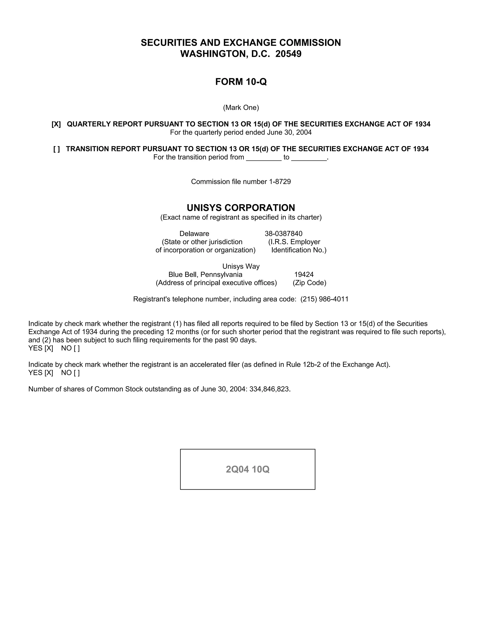 This SEC filing is Unisys Corporation's quarterly report on Form 10-Q for the quarter ended June 30, 2004. It includes Unisys' consolidated financial statements, including their balance sheet, income statement, and statement of cash flows for the quarter. It also provides notes to the financial statements and breaks down revenue and operating results by business segment. The filing provides investors with Unisys' financial performance and position for the quarter according to US GAAP and SEC regulations.