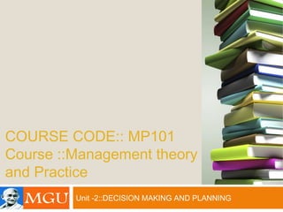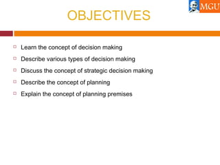 This document discusses decision making and planning in management. It defines decision making as selecting the best alternative from available options to solve problems. Planning determines how to achieve goals set in the decision making process. Strategic decision making aims to achieve organizational objectives by integrating functions and considering stakeholders. Effective planning requires clear goals, policies, procedures and budgets. Reasons for planning failure include improper preparation, unclear goals and lack of management support.