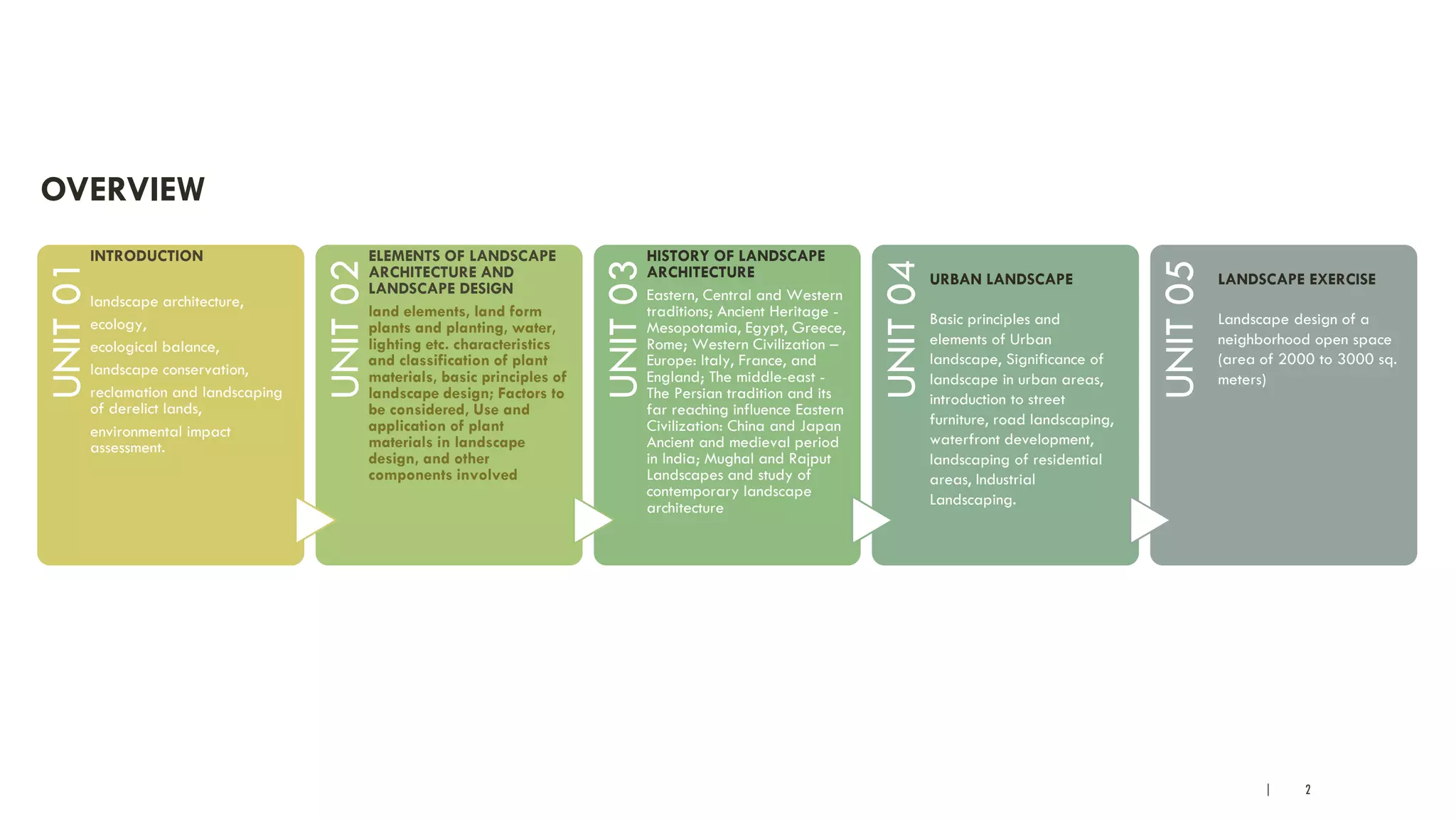 This document provides an overview of the key elements and concepts in landscape architecture. It discusses landscape architecture, landforms, planting design, water features, and urban landscapes. The document is divided into 5 units that cover the introduction to landscape architecture, elements of landscape design, history of landscape architecture, urban landscapes, and landscape exercises. It also provides details on landforms, contour lines, ridge and valley systems, watersheds, vegetation, and planting design principles.