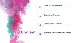 Production drawings provide complete details for manufacturing and assembling products. They are used by machine operators, production workers, and supervisors. Limits, fits, and tolerances are important concepts for production drawings. There are different types of tolerances including unilateral and bilateral tolerances. Fits describe the relationship between mating parts like holes and shafts, including clearance fits with space between parts and interference fits with contact between parts. Production drawings ensure correct manufacturing and assembly of parts.