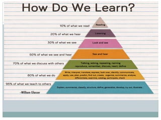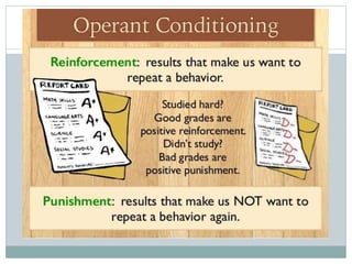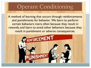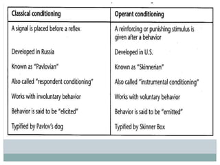 The document discusses the nature of learning, defining it as a long-term change in knowledge or behavior due to experience, and emphasizing its importance for human development. It covers various learning theories, including classical conditioning, operant conditioning, and cognitive development, illustrating how learning can occur through direct and vicarious experiences. Additionally, it outlines conditions and types of learning, demonstrating that learning is a continuous, adaptive process essential for personal growth and behavior modification.