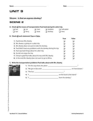 1) Cheryl discusses transportation options with Mrs. Beatty for her upcoming safari trip to Botswana, including planes, trains, buses, taxis, and donkeys.