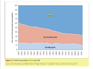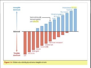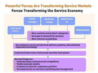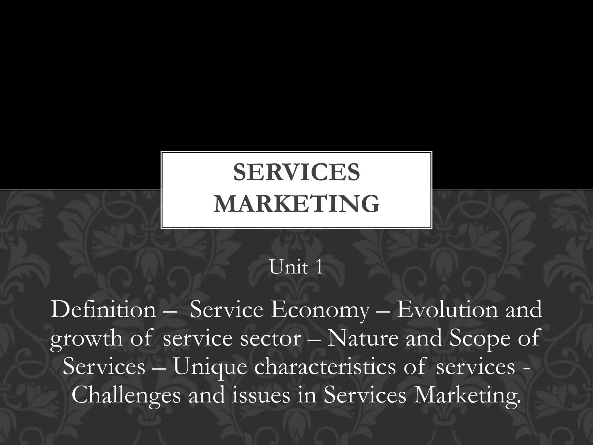 The document discusses the evolution and characteristics of services marketing in the context of the Indian economy, emphasizing the significance of the tertiary sector which accounts for 60% of GDP. It outlines various challenges in services marketing, such as intangibility, perishability, and the impact of technological advancements on service delivery. The evolution of the service marketing field is detailed across multiple eras, highlighting the need for a multidisciplinary approach and collaboration among scholars.