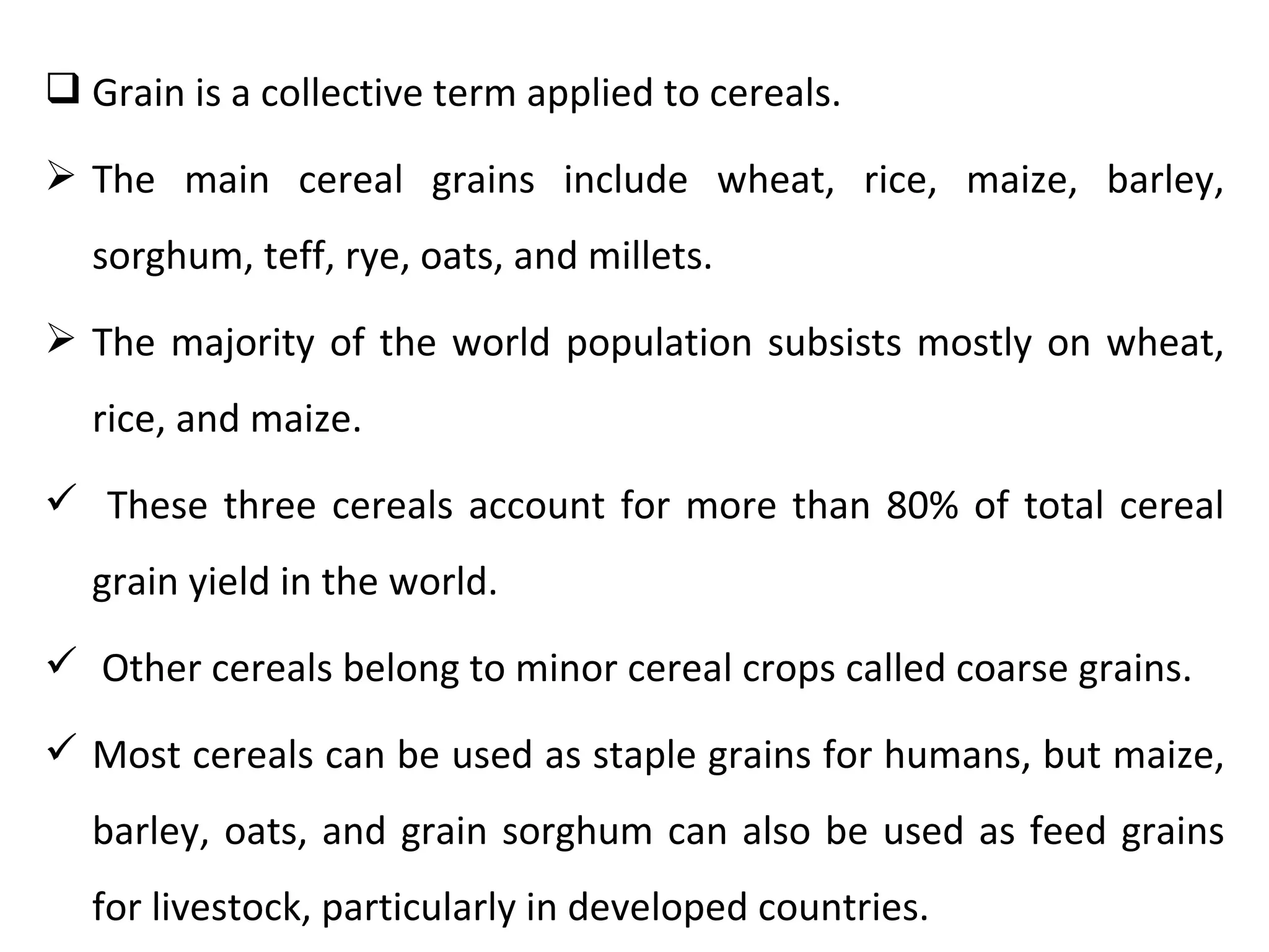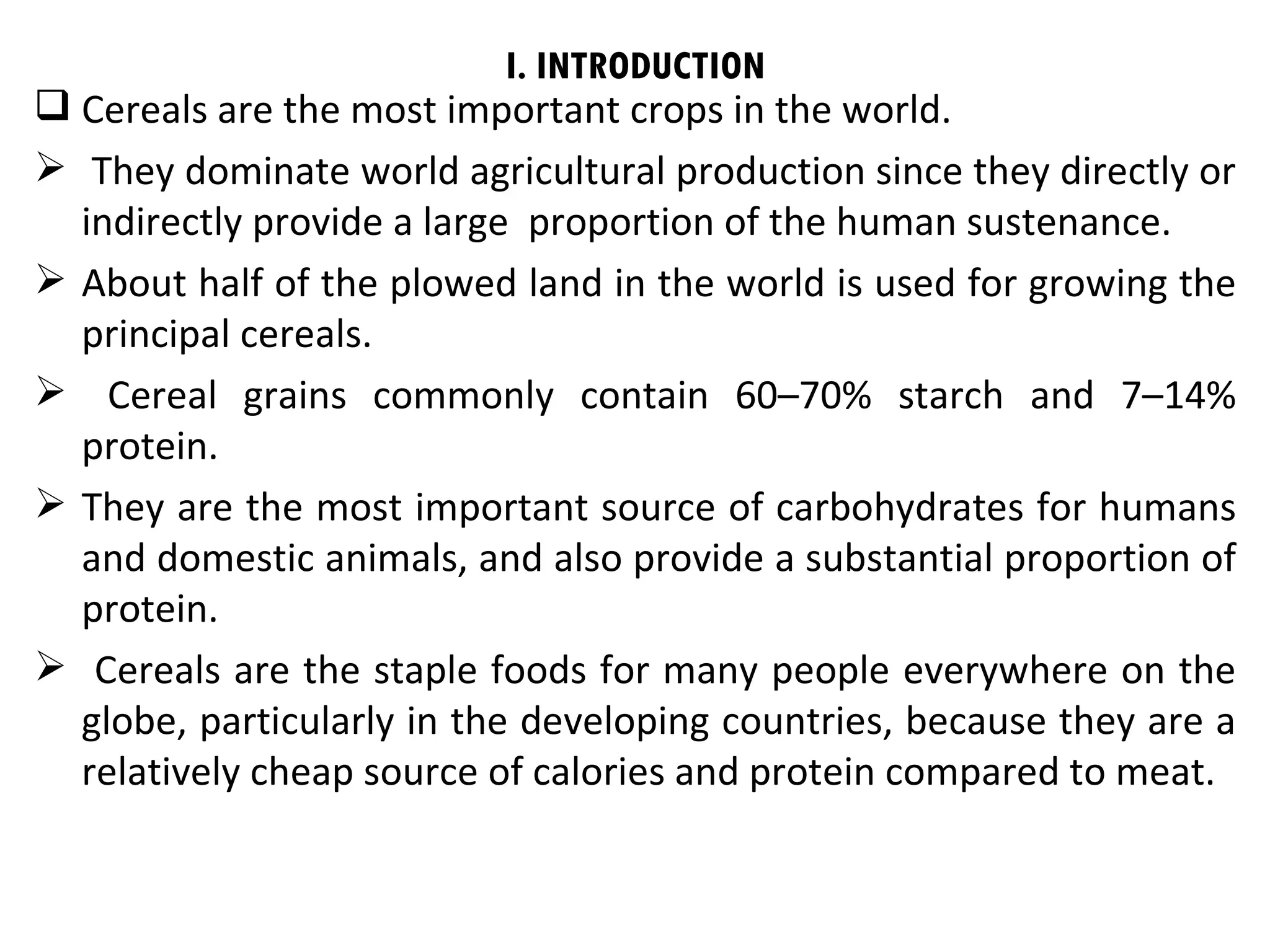 This document provides an overview of cereals. It states that cereals are the most important crops worldwide, dominating agricultural production and providing sustenance. The main cereal grains are wheat, rice, maize, barley, sorghum, rye, oats, and millets, which account for over 80% of cereal production. Cereals are members of the grass family and are a staple food worldwide, particularly in developing countries, as they are a relatively cheap source of calories and protein.