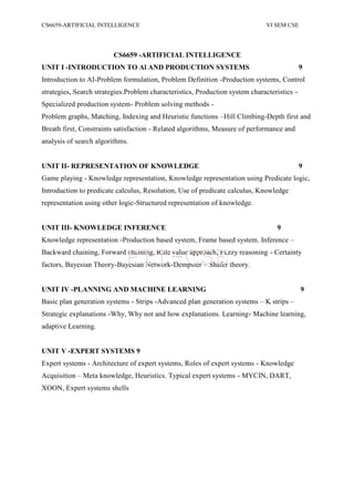 This document discusses the syllabus for the course CS6659 - Artificial Intelligence. It covers 5 units: (1) introduction to AI and production systems, (2) knowledge representation, (3) knowledge inference, (4) planning and machine learning, and (5) expert systems. It also provides definitions of AI, discusses the history and components of AI, and describes the differences between weak AI and strong AI. The document gives an overview of the key concepts and topics that will be covered in the AI course.
