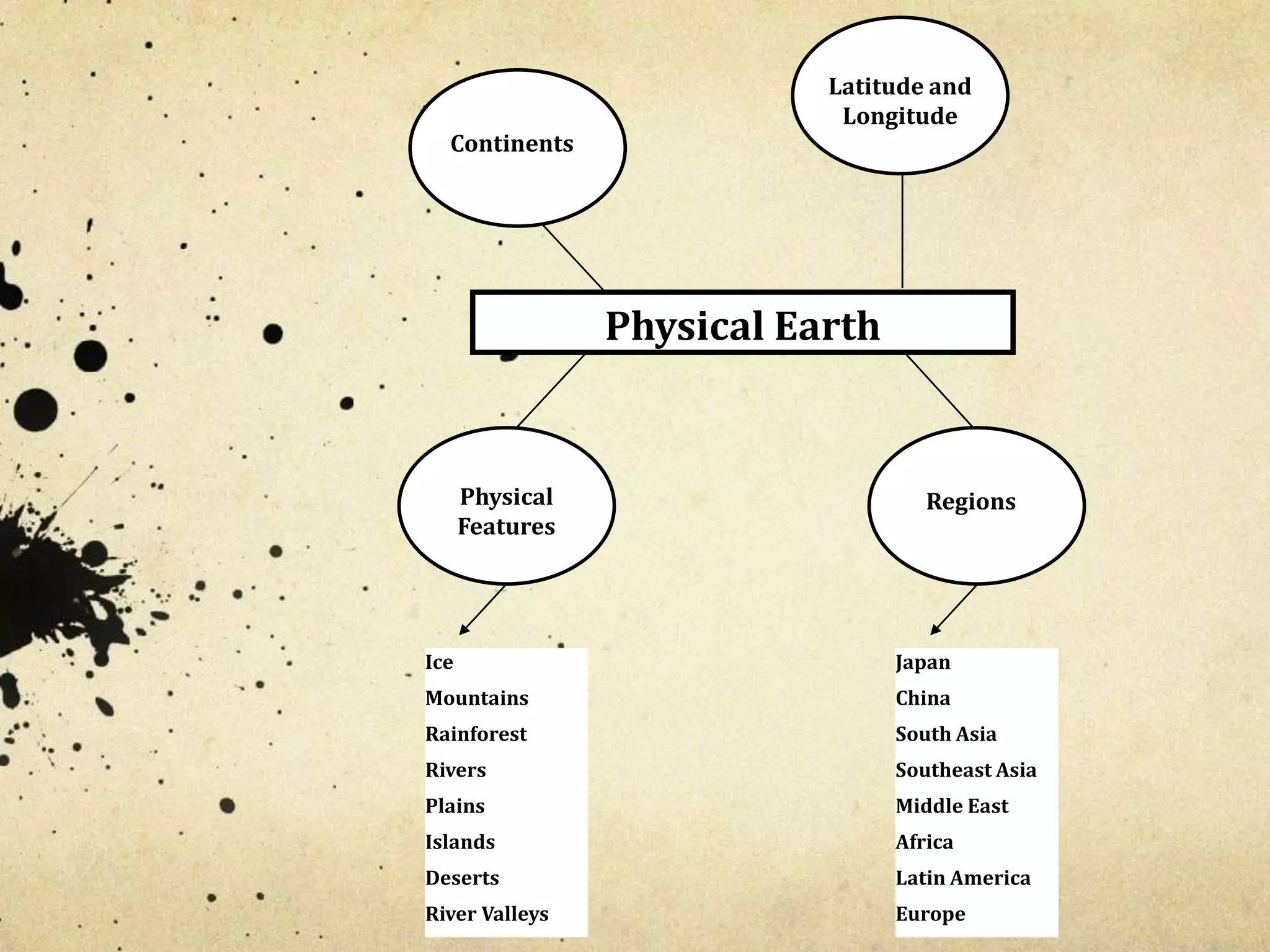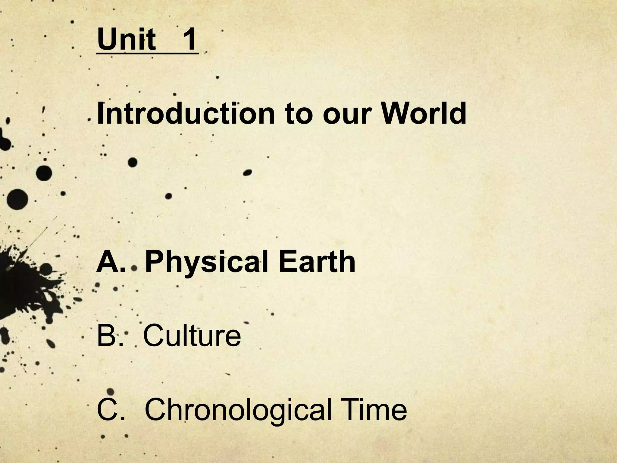 This document provides an introduction to physical earth and culture. It defines key physical features like continents, latitude, longitude and describes major physical features of the earth like mountains, deserts, rivers. It also introduces culture and the 8 elements of culture. Physical features like mountains, deserts, rivers can act as barriers or transportation routes influencing the spread and interaction of different cultures.