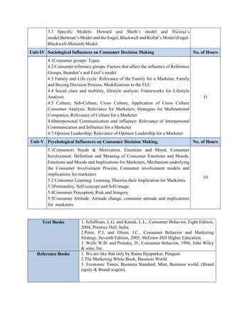 The document outlines the course outcomes and units for a consumer behavior course. On completion of the course, learners will be able to identify, explain, use, differentiate, appraise, and create in relation to concepts of consumer behavior. The course covers 6 units, including introduction to consumer behavior, consumer decision making process, models of consumer behavior, sociological influences, psychological influences, and interdisciplinary nature of consumer behavior.