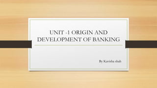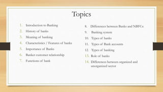 This document provides an overview of the origin and development of banking in India. It discusses the history of banks in India dating back to the 18th century with the establishment of banks like Bank of Hindustan and presidency banks. It then covers the nationalization of banks in India in 1969 and 1980. The document also defines key banking terms like banks, characteristics of banks, and functions of banks such as accepting deposits and lending funds. It provides context on the various types of banks that operate in India and how the banking system works.