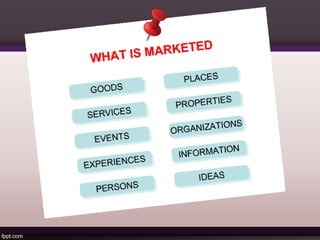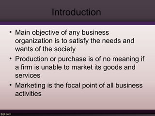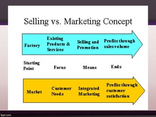 The document provides an overview of the nature and scope of marketing. It defines marketing according to various authorities and outlines its core concepts. Marketing is defined as the process of creating, communicating, and delivering value to customers and managing customer relationships. The key elements of the marketing environment, including the internal, micro, and macro environments are described. The document also discusses customer satisfaction, value, and Michael Porter's value chain model.