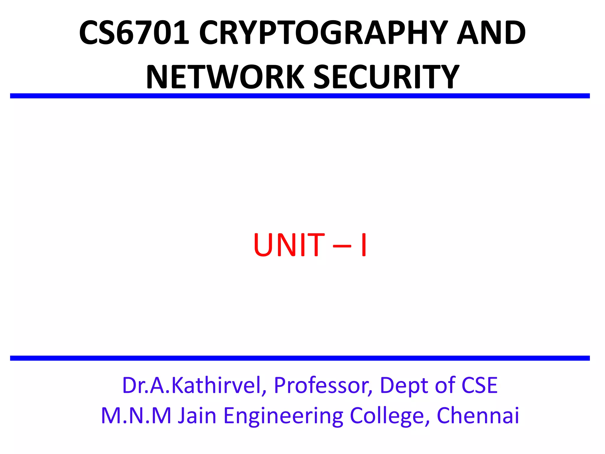 The document covers the fundamentals of cryptography and network security, focusing on definitions, security architecture, attacks, and mechanisms. It introduces classical encryption techniques and delves into concepts such as symmetric and asymmetric ciphers, cryptanalysis, and various cryptographic systems. The document also emphasizes the importance of protecting information in transmission and storage, detailing methods like steganography and different encryption techniques.