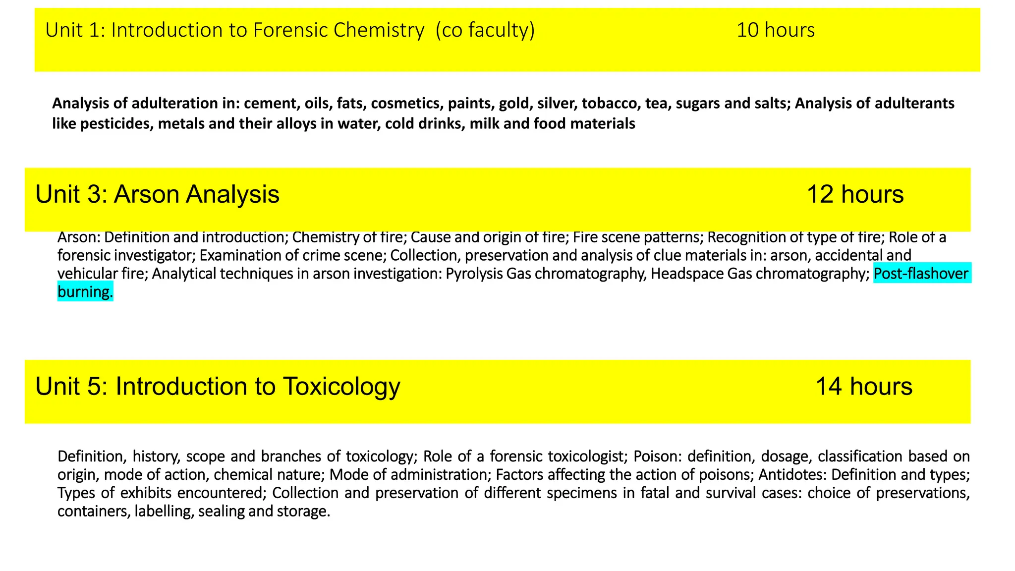 The document provides an extensive overview of forensic chemistry relevant to arson, toxicology, and analysis of adulteration in various materials. It details methodologies for sampling, testing, and analysis of substances like cement, cosmetics, and edible oils, utilizing techniques such as gas chromatography and titration. Additionally, it covers detection of contaminants and adulterants, emphasizing the importance of analytical methods in forensic investigations.