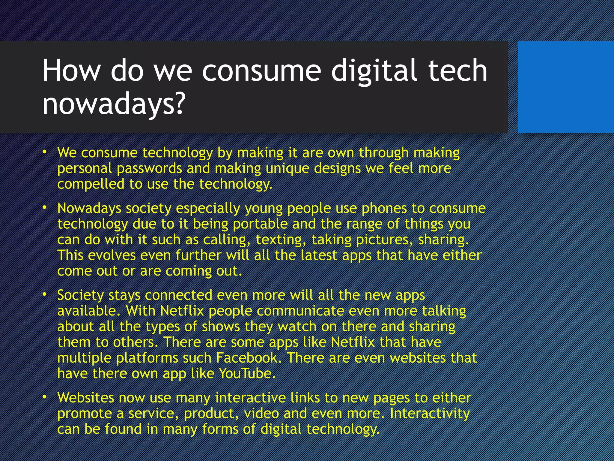 The document discusses how technology is consumed in modern society. It notes that people customize technology through passwords and designs, making them feel more connected to their devices. Most notably, young people heavily rely on their phones to consume technology as phones are portable and allow activities like calling, texting, photos, and accessing various apps. As more apps are created or updated, people can stay connected through sharing content on platforms like Netflix and YouTube. Websites also promote interactivity through multiple linked pages to share services, products, videos, and more.