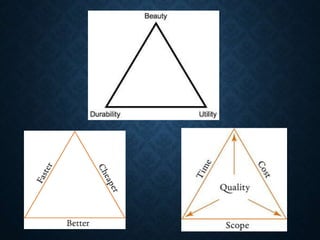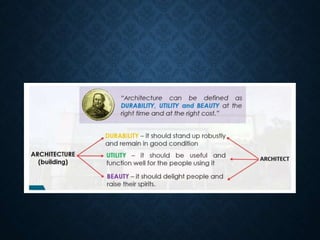 The document provides an introduction to the key components and concepts of architecture. It discusses architecture as a response to human needs and culture. The main components identified are use, means, site, shelter, structure, skin, materials, services, circulation, aesthetics, and experience. The document then examines the functional, aesthetic and psychological aspects of architecture in more detail. It identifies primary needs like shelter and discusses the origins and definitions of architecture. Key concepts covered include site, structure, skin, circulation, materials, mass, space, proportion, symmetry, balance, contrast, pattern, and decoration. The document emphasizes that architecture must address functional, aesthetic and psychological needs.