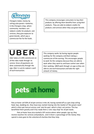 The document discusses different business concepts including business plans, business models, and examples of specific company business models. It provides details on Pets at Home's business model which aims to become the best pet care business through various strategies like offering a range of services in stores, using customer data to personalize experiences, and generating 50% of sales from pet services. The document also provides examples of other companies' business models like Airbnb, Uber, and Changers.