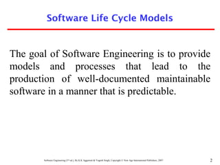 The document discusses various software engineering models, including the build & fix model, waterfall model, incremental process models, and the spiral model, detailing their advantages and disadvantages. It emphasizes the importance of proper requirement definitions, user participation, and risk management in selecting an appropriate software life cycle model. The unified process is outlined as a structured method for producing maintainable software within specific time and budget constraints.