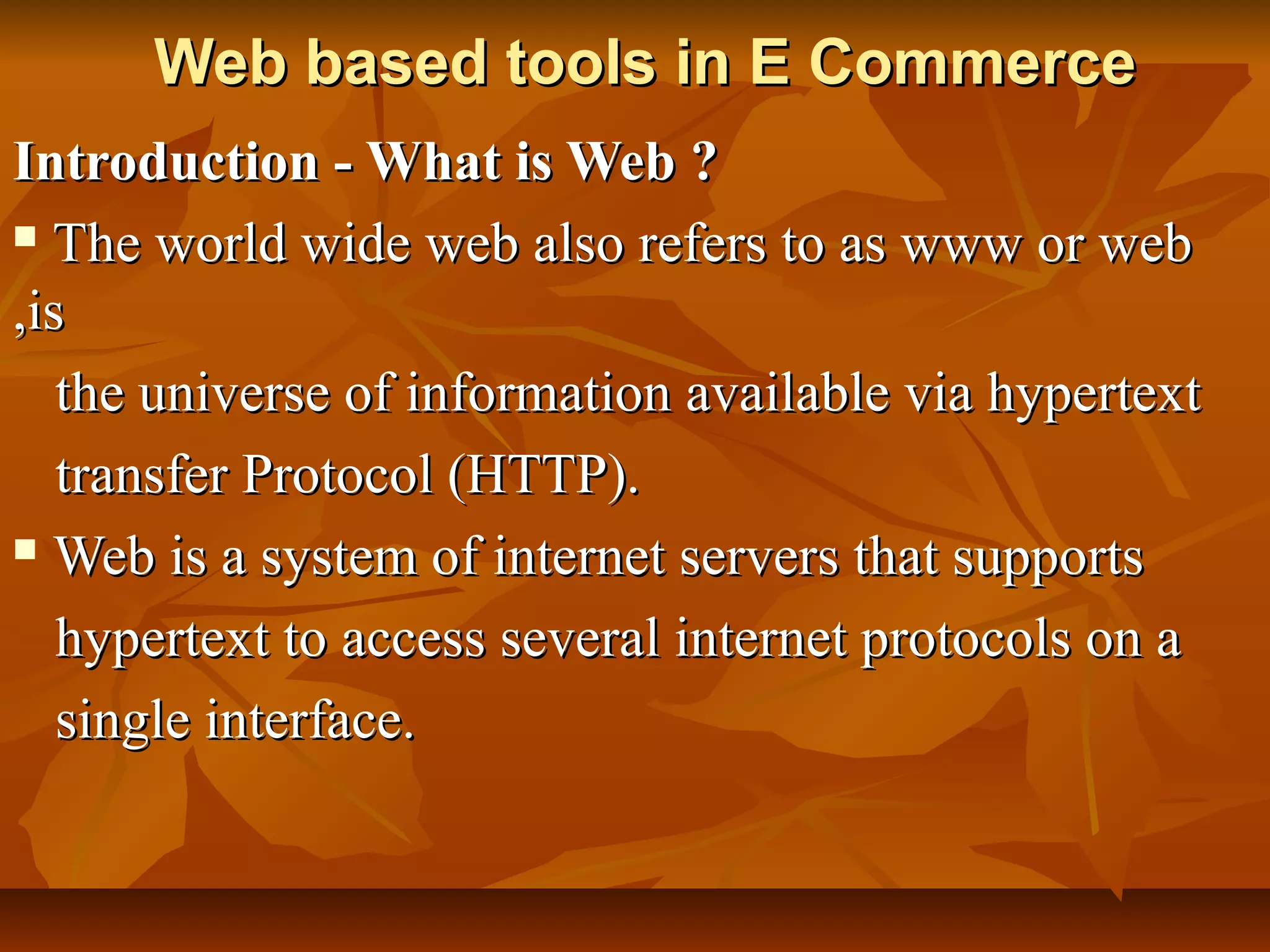 The document discusses various web-based tools used in e-commerce, including the world wide web (www), HTTP, SMTP, FTP, and TCP/IP. It defines the web as a system of servers supporting hypertext transfer protocol to access internet resources. URLs are described as unique addresses for websites containing information on the access method and resource. HTTP is explained as the method for transferring hypertext files like web pages over the internet using hyperlinks to connect documents. Intranets and extranets are introduced as internal or restricted external networks that use internet standards for communication within or between organizations.