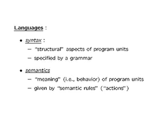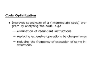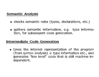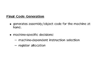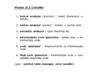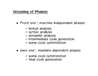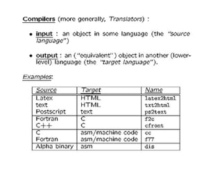 A compiler is a program that translates a program written in a source language into an equivalent program in a target language. It has two main parts - a front end that handles language-dependent tasks like lexical analysis, syntax analysis, and semantic analysis, and a back end that handles language-independent tasks like code optimization and final code generation. Compiler design involves techniques from programming languages, theory, algorithms, and computer architecture. Regular expressions are used to describe the tokens in a programming language.