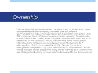 Celador is a global light entertainment company originally formed as an independent production company in the UK. It produces films, television shows, and manages radio stations. Some of its successful productions include Slumdog Millionaire, Dirty Pretty Things, and The Descent. Celador operates on a project-by-project basis and contracts freelance staff for each production. It is considered a small but successful production company when compared to similar UK independents like DNA Films and Film4 Productions, as well as larger companies like Sony Pictures Entertainment.