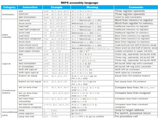 The document outlines a syllabus for a computer science course focusing on computer architecture, covering topics such as basic computer system structure, arithmetic operations, processor control units, parallelism, and memory/I/O systems. It includes details on MIPS architecture, instruction set architecture (ISA), and MIPS assembly language with examples and exercises. Additionally, it provides information on textbooks and essential concepts related to instruction representation, data transfer, and performance considerations.