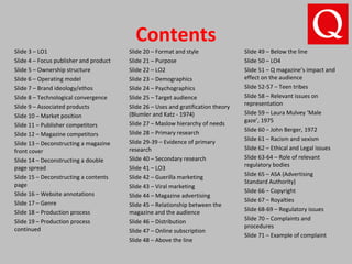 Bauer Media group owns Q magazine, a UK-based rock music magazine founded in 1986. Bauer Media is a large multi-media company based in Germany with over $2.9 billion in revenue and 11,000 employees worldwide. Q magazine focuses on rock music news, reviews, and interviews with artists in the genre. It uses a variety of marketing strategies to promote the magazine such as advertising, social media, and guerrilla marketing tactics. The magazine faces competition from other music publications but maintains a niche as a rock-focused title. Regulations around advertising, copyright, and complaints procedures must be followed.