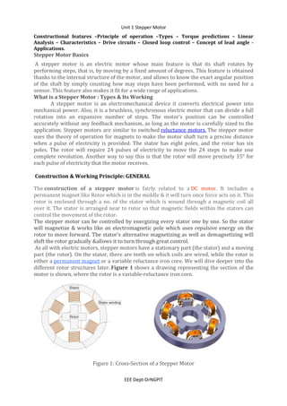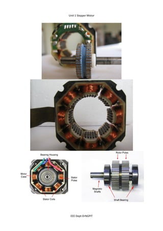 This document provides information about stepper motors, including their construction, working principle, types, and applications. It discusses the key features of stepper motors, namely that the shaft rotates in discrete steps allowing precise angular position control without feedback sensors. It describes the basic components of a stepper motor including the stationary stator with electromagnetic coils and the moving rotor. Variable reluctance rotors are discussed as one common type where the rotor moves to minimize the magnetic reluctance between it and the stator fields. The document also covers stepper motor operation, noting they are controlled by energizing the stator coils in sequence which generates torque on the rotor to move it in discrete angular steps.