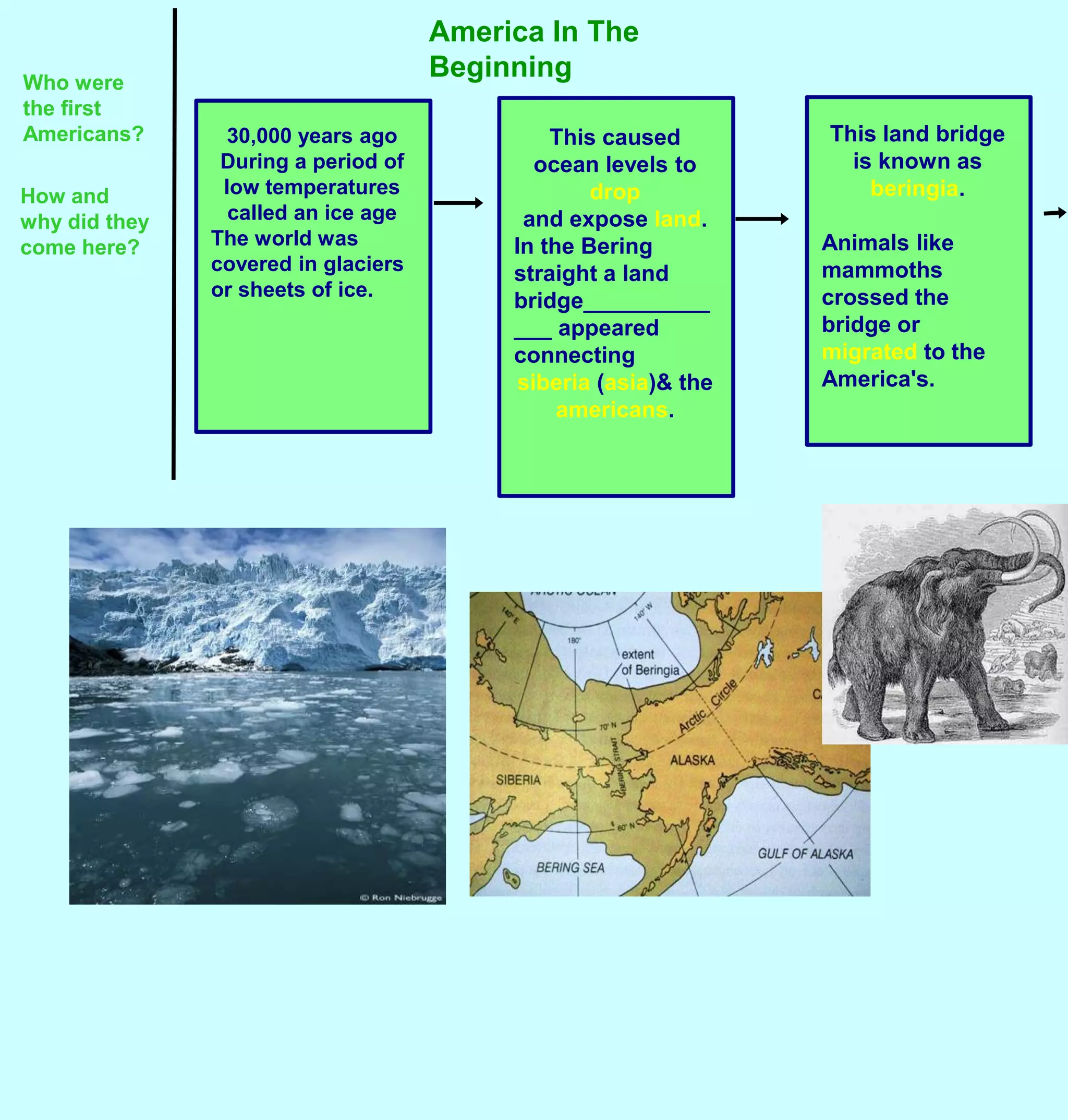 The first Americans crossed into North America from Asia over a land bridge between Siberia and Alaska around 30,000 years ago during the last ice age. As the climate warmed, glaciers melted and sea levels rose, submerging the land bridge. Native Americans adapted to their diverse environments across North America by developing different ways of life and cultures to make use of the varied natural resources available to them, such as food sources, materials for shelter and clothing. However, they also shared some common traits including a spiritual connection to nature, not owning land, only taking what was needed, and participating in trade networks.