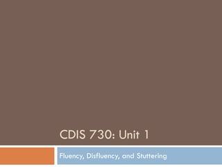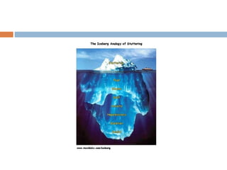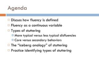 The document discusses various aspects of fluency and stuttering. It defines fluency as smooth, continuous speech produced in an effortless manner. It describes different types of disfluencies that can occur, ranging from more typical ones like filler words, repetitions and revisions, to less typical ones associated with stuttering like part-word repetitions, prolongations and blocks. It also discusses core behaviors of stuttering versus secondary behaviors, the stuttering cycle, and how stuttering can be represented using the iceberg analogy.