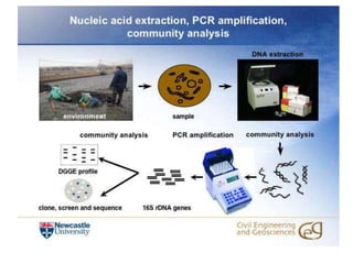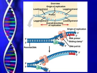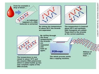 This document provides an overview of genetics and DNA. It discusses the location of DNA in cells, the structure of DNA, the discovery of DNA's role as the genetic material, DNA replication, and applications of DNA technology. Some key points include: DNA is found coiled in chromatin in the nucleus; it has a double helix structure with adenine pairing with thymine and guanine pairing with cytosine; experiments in the 1950s showed that DNA carries genetic information; DNA replicates semi-conservatively before cell division; and recombinant DNA techniques have led to production of insulin and other proteins through genetically modified bacteria.