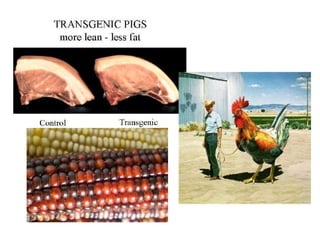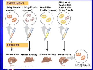 This document provides an overview of genetics and DNA. It discusses the location of DNA in cells, the structure of DNA, the discovery of DNA's role as the genetic material, DNA replication, and applications of DNA technology. Some key points include: DNA is found coiled in chromatin in the nucleus; it has a double helix structure with adenine pairing with thymine and guanine pairing with cytosine; experiments in the 1950s showed that DNA carries genetic information; DNA replicates semi-conservatively before cell division; and recombinant DNA techniques have led to genetically modified organisms that produce useful products like insulin.