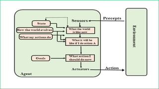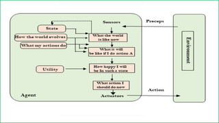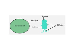 The document discusses intelligent agents, defining them as entities that perceive their environment and act upon it through various means, such as sensors and actuators. It details the nature of different agents, the environments they operate in, and concepts like rationality, learning, and autonomy, emphasizing how agents can adapt and improve their performance over time. Additionally, it categorizes agents based on their intelligence and capability, ranging from simple reflex agents to learning agents, while outlining the importance of task environments in agent design.