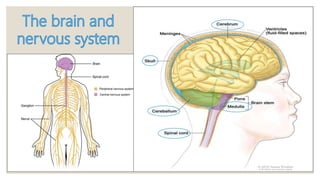 The document discusses the functions of the nervous system. It states that the nervous system sends messages from the brain to different parts of the body to allow responses to stimuli from the senses. It also controls internal systems like digestion and respiration. The brain is the most important organ as it controls the nervous system and processes information from the senses. It is made up of the cerebrum, cerebellum and brain stem which control cognitive thinking, movement and involuntary functions respectively. The spinal cord runs from the brain down the spine and controls reflex actions.